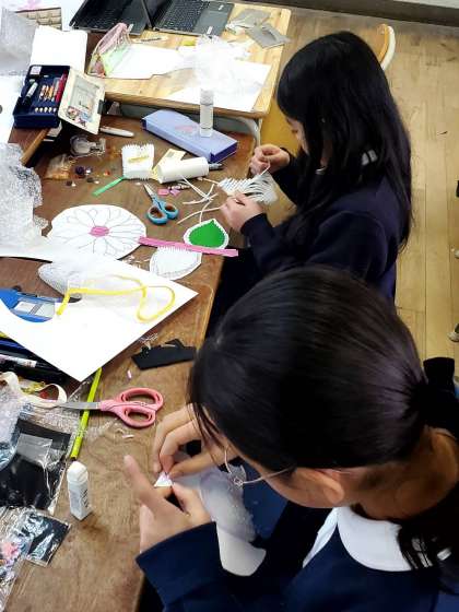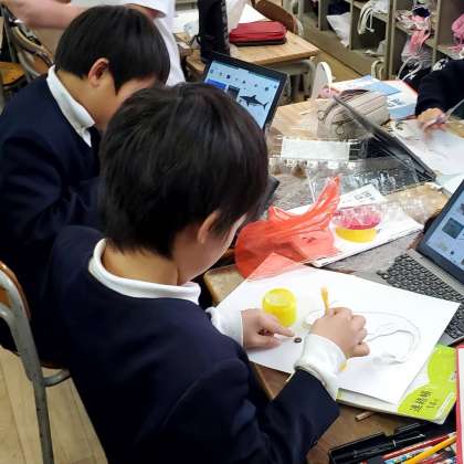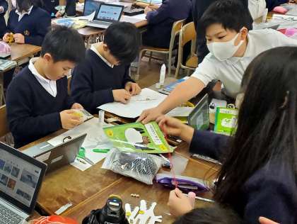 同じく4時間目、3年生が図工の学習をしている様子です。自分が作りたい生き物をタブレットで調べ、思い思いの材料を使って作品作りに取り組んでいました。個性的な生き物が出来あがりそうです。