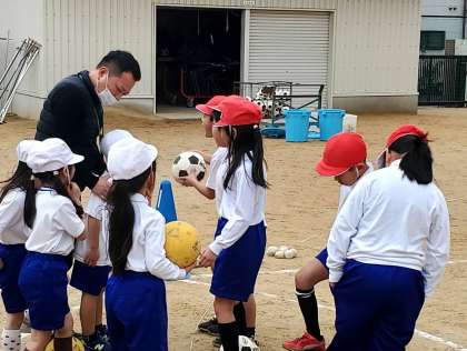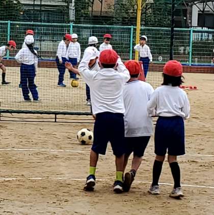 今日の2時間目、1年生が体育の学習をしている様子です。1・2組は運動場でボール蹴りゲームを、3組は体育館でなわ跳びをしていました。ボール蹴りゲームでは、少しずつゲームの仕方が分かり、動きもだんだん良くなってきています。