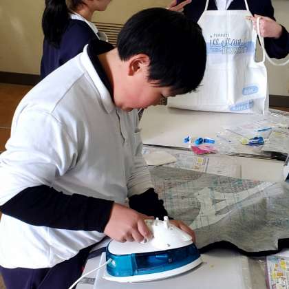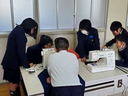 5時間目、5年生が家庭科室でエプロン作りをしている様子です。中にはもう完成した子どももおり、わざわざ職員室まで見せに来てくれました。
