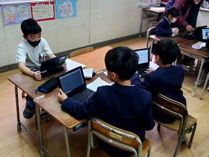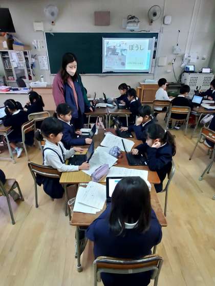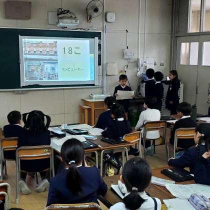 今日の3時間目、2年生が生活科の学習をしている様子です。自分たちで作ったスライドを示しながら、町たんけんで見てきたことなどを発表しています。