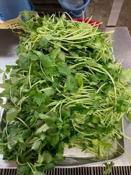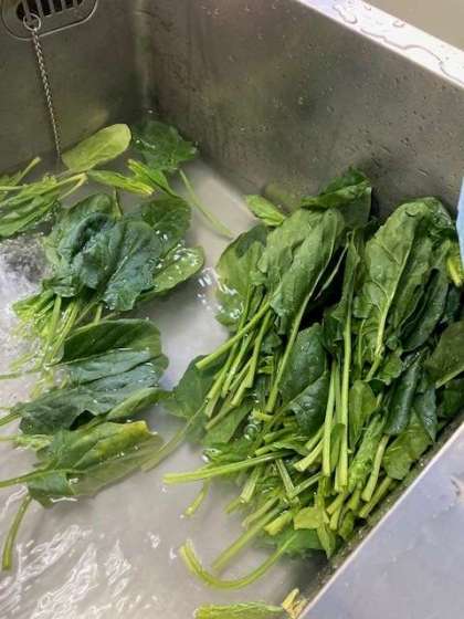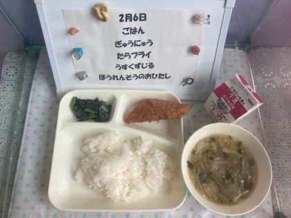 今日の給食は「たらフライ、うすくず汁、ほうれんそうのおひたし」でした。うすくず汁の中のみつば、おひたしのほうれんそうは、生のものをひとつずつ丁寧に洗って調理してもらっています。全部でみつばは2kg、ほうれんそうは、なんと25kg!洗うのはとてお大変です。みなさん、残さず食べてくださいね。