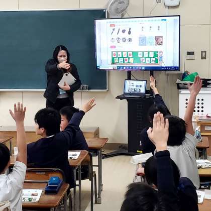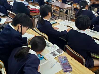 今日の5時間目の3年生の様子です。1組は社会、2組は英語の学習をしていました。社会は戦争の頃の人々のくらしについて、英語は自分が選んだカードは何かを、ヒントを出しながら友達に当ててもらう学習をしていました。積極的に手を挙げて発表しようとがんばっていました。