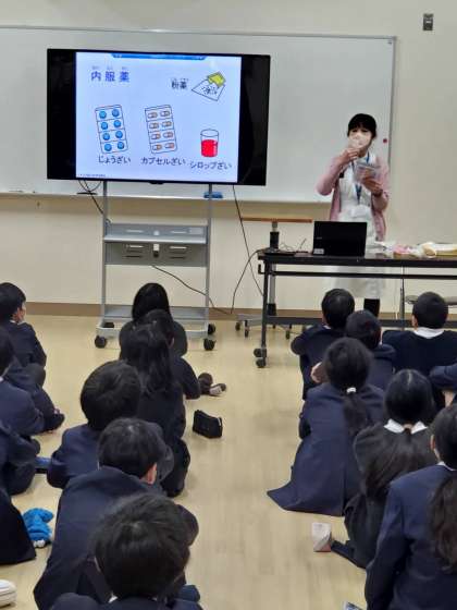 今日の4時間目、6年生を対象に学校薬剤師の濵田先生を講師にお招きして、薬の正しい使い方教室を実施いたしました。