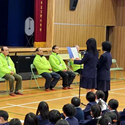 今日の朝会時、見守り隊の方々を学校にお招きして、感謝する会を行いました。