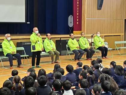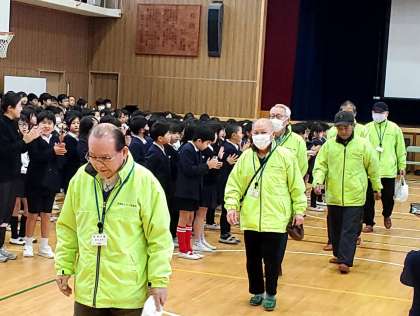 代表児童のお礼の言葉の後、見守り隊の方のお話を聞き、その後校歌を全員で歌ってお見送りしました。