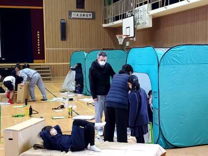 始めに能登の震災の復興支援に行っておられた方のお話を聞いた後、避難所の体験をしました。