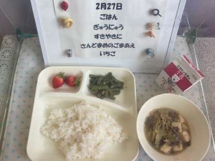 今日の給食は「すきやき煮、さんどまめのごまあえ、いちご」でした。すきやき煮は、牛肉がたっぷりで甘辛でおいしく、ごはんが進みました。季節の果物のいちごは、みんなが楽しみにしていました。3月6日もいちごが登場します。お楽しみに!