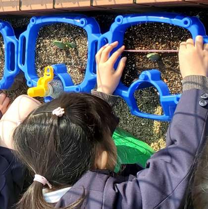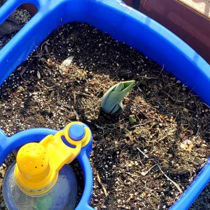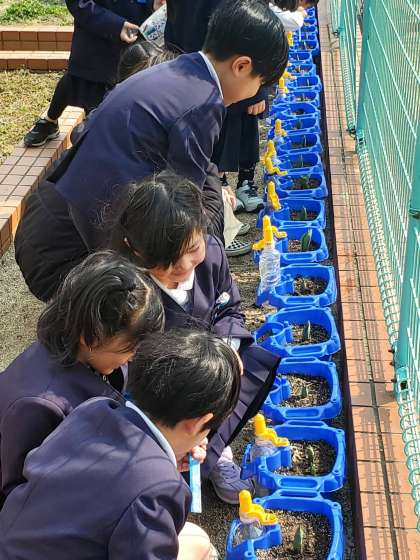 今日の3時間目、1年生が今育てているチューリップの様子を観察していました。
