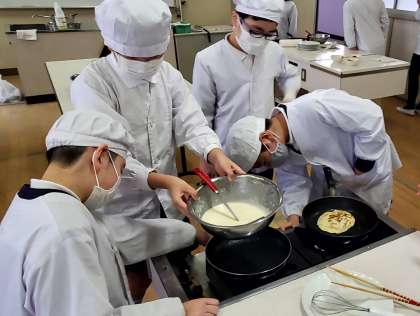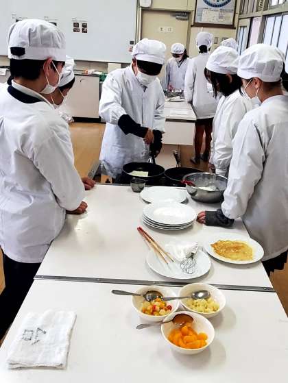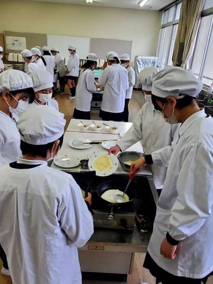 今日の5・6時間目、6年1組が若野先生にも手伝ってもらいながらクレープを作っていました。なかなかうまく焼けずに苦戦しているグループもありましたが、楽しみながら調理する姿にほっこりしました。ちなみに2組は8日にする予定です。