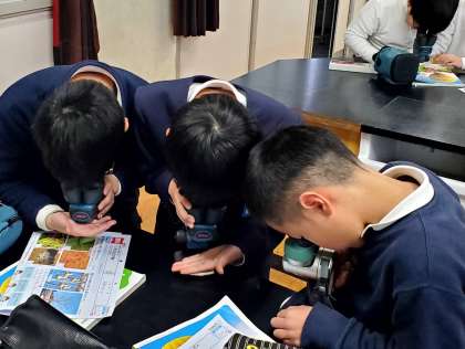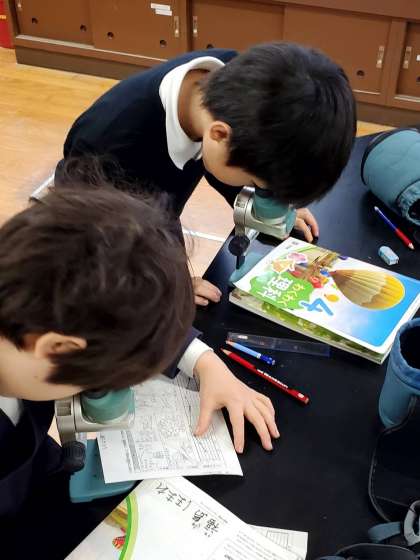 同じく2時間目、4年生が理科の学習をしている様子です。今日は顕微鏡の使い方について勉強していました。始めはピントの合わせ方が少し難しかったようですが、色々な物を見るうちに、だんだん上手になっていきました。