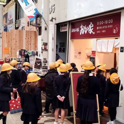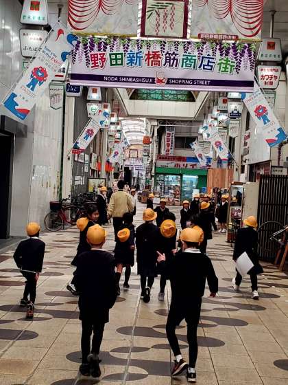 今日、3年生が総合的な学習の時間に訪問するなどして、色々教えていただいた新橋筋商店街の皆様にお礼を言いに行きました。