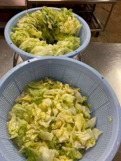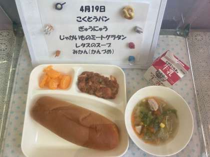 今日の献立は「じゃがいものミートグラタン、レタスのスープ、みかん(缶)」でした。レタスは今月1回だけ使用できる旬の野菜です。15キロ使っているので、50個のレタスを1枚ずつ丁寧に洗って調理しています。ミートグラタンは、今年度より米粉でとろみをつけています。小麦アレルギーの児童も食べることができるようになりました。