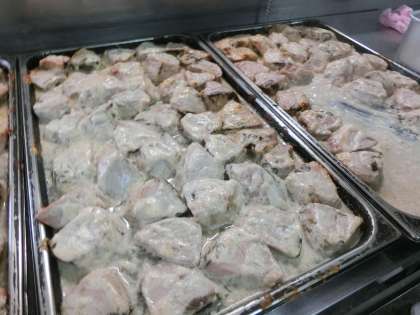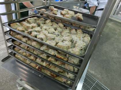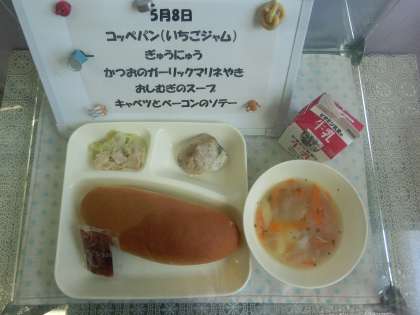 今日の給食は「かつおのガーリックマリネ焼き、押麦のスープ、キャベツとベーコンのソテー」でした。かつおに塩、こしょう、にんにく、ノンエッグドレッシング(卵の入っていないマヨネーズ)で味つけして、焼き物機で焼いています。下味をつけることで、かつおのパサつきをおさえて食べやすくしています。