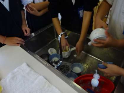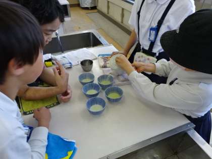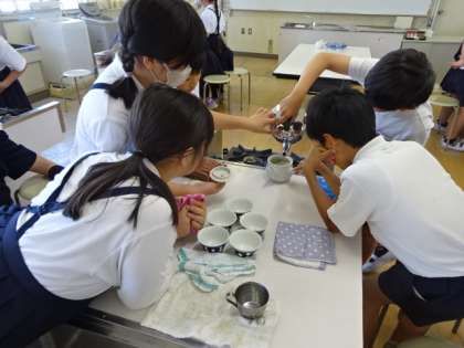 今日、家庭科の学習で、お茶を淹れました。急須を使って、どの湯のみも同じ濃さになるようにする淹れ方も上手にできていました。最後の片づけも、グループで協力していました。みんな普段から家でお手伝いをしているのか、手際よく洗うことができていました。