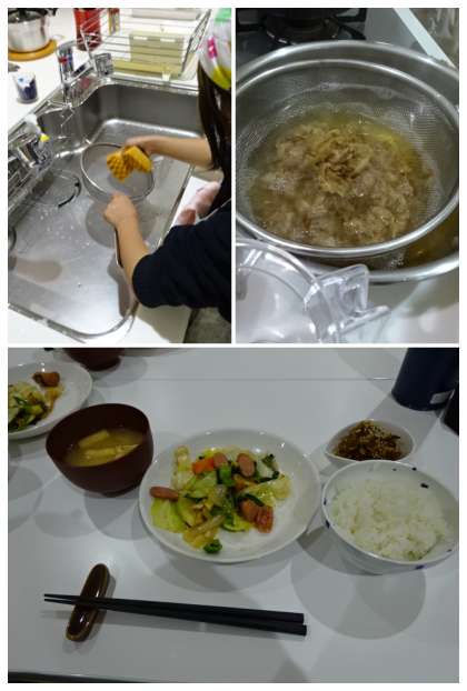 お昼には調理実習「エコクッキング」をしました。野菜炒め・みそ汁・ふりかけを作り、なべでご飯を炊きました。