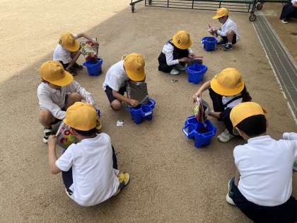 生活科でアサガオのたねをうえました。たねをうえる前に観察しました。「スイカの形みたいだなぁ」「黒色と思っていたけど、茶色っぽいなぁ」とじっくり観察できました。