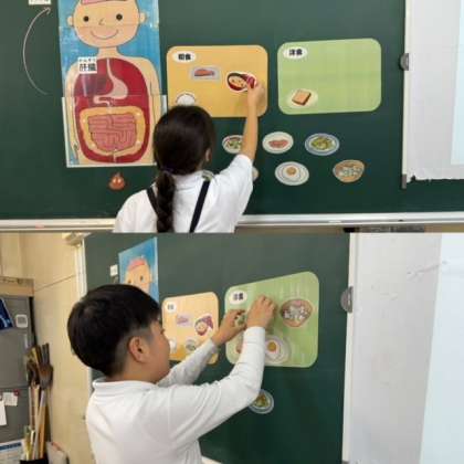 栄養指導がありました。主食、主菜、副菜が入った栄養バランスのとれた朝ごはんを食べることが大切だと学びました。