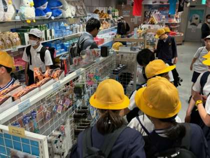大水槽の前でグループ写真を撮影し、班ごとに見学に出発しました。早速、お土産を買う班もあります。