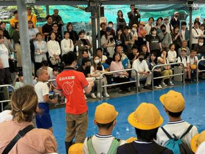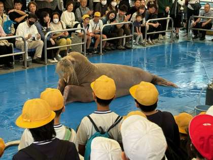 ?セイウチとのふれあいタイムです。お客さんの代表として、セイウチのツララちゃんとふれあいました。