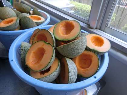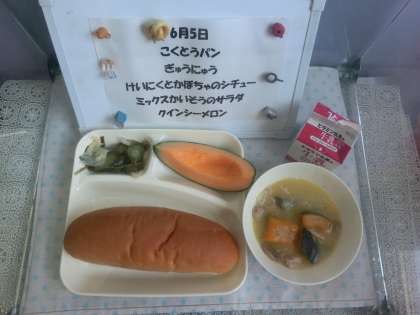6月5日(水)の給食は「鶏肉とかぼちゃのシチュー、ミックス海そうのサラダ、クインシーメロン」でした。クインシーメロンは年1回のデザートです。調理員さんに中の種をきれいにとって、8等分に切っていただきました。シチューは、アレルギーに配慮し、乳や小麦不使用のものを使っています。