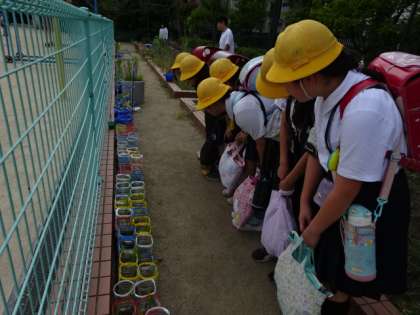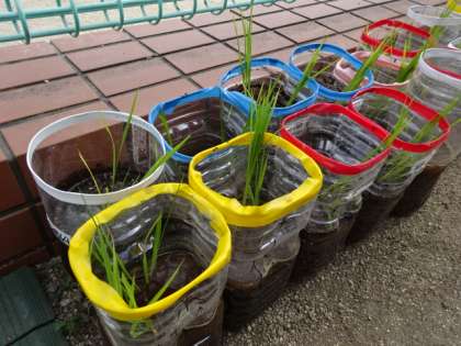 総合の学習で、食糧生産に触れる学習の一つとして、稲を植えました。「え?この草にお米ができるの?」と、子どもたちは半信半疑な様子でした。お米を育てることのたいへんさに気付くことで、食べ物を大切にする心につながればいいなと思います。