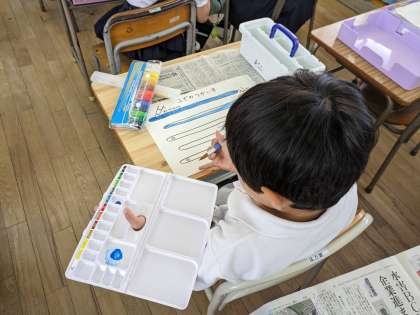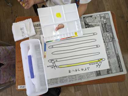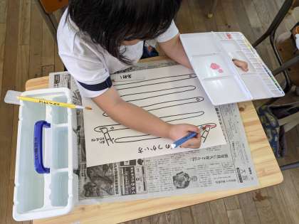 初めての絵の具をしました。まずは線を引く練習をしました。「まっすぐかくのが難しい」や「おおーすごい‼」「上手にかけたよ」など、とても楽しそうに活動していました。もっといろいろな作品を作っていきましょう。