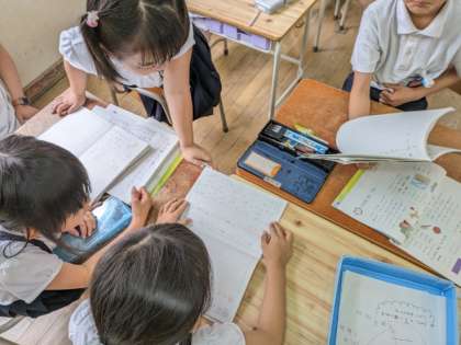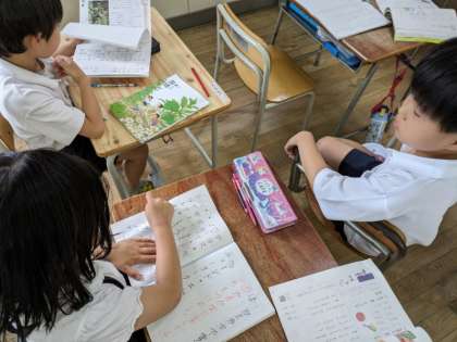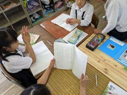 国語の学習でグループになって「かたかなで表す言葉」を見つけたり、物語の感想を伝えあったり、好きな場面について伝えあったりしました。同じ意見には「ぼくもいっしょ」「ちょっとにてる」といった声があり、違う意見には「そうなんだあ」「いい意見だね」と言って楽しく交流していました。