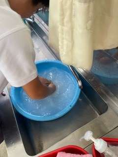 家庭科の学習で洗濯の実習を行いました。水着の水洗いなど家でもできることをやるように、子どもたちに伝えています。