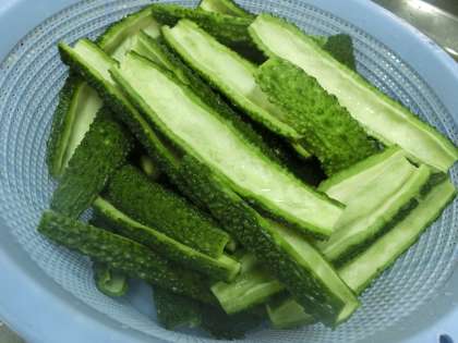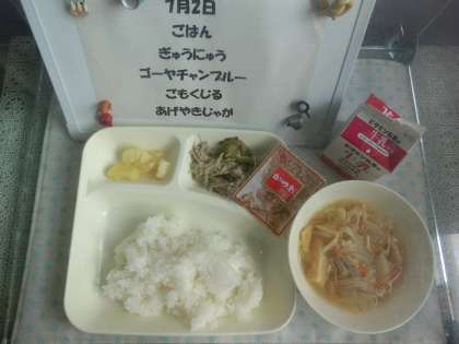 7月2日(火)の給食は「ゴーヤチャンプルー、五目汁、あげ焼きじゃが」でした。にがうり(ゴーヤ)は年1回だけ登場する食材です。1人8gの使用で豚肉ともやしと合わせていため、かつおぶしをかけていただきました。苦みもほとんどなく、おいしく食べることができました。あげ焼きじゃがは、多めの油でじゃがいもを焼きました。子どもたちに大好評でした。