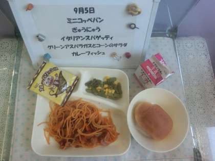 9月5日の給食は「イタリアンスパゲッティ、グリーンアスパラガスとコーンのサラダ、カレーフィッシュ」でした。スパゲッティは豚肉、ウインナー、たまねぎ、にんじん、ピーマンが入り、ケチャップ、トマトピューレ、ウスターソースで味つけしています。とてもおいしく大好評でした。カレーフィッシュは、ミニフィッシュのカレー味で、給食初登場でした。