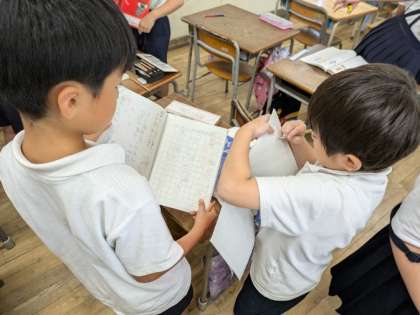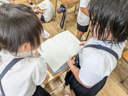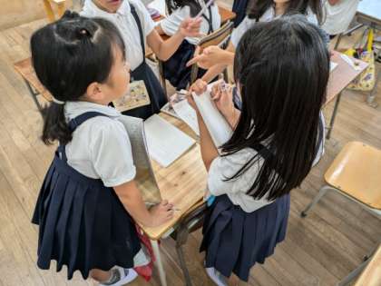 子どもたちは、自分が行ってみたいお話の世界とそこで何をしてみたいのか、友だちと話し合う活動をしました。質問したり相槌を打ったりして、ことばをつないで話し合っていました。