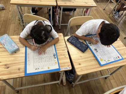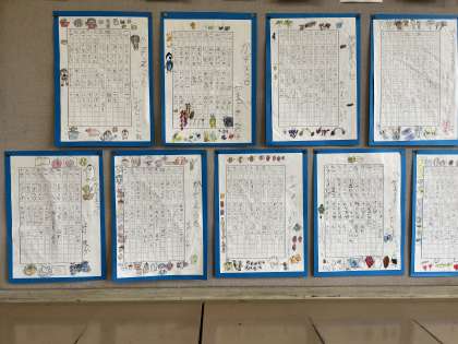 国語では「かぞえうた」を学習した後に、自分で考えたオリジナルのかぞえうたを作りました。ものの数え方だけでなく、一つひらひら、二つふかふかなど、韻をふんだことばも考えて作っていくので少し難しかったですが、みんな上手に作ることができました。できたものは教室の後ろに掲示しているのですが、友だちの作ったかぞえうたを見て、「面白いなぁ」「思いつかなかったなぁ」など、お互いに良さを伝え合っていました。