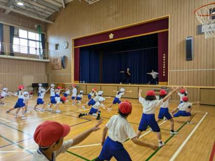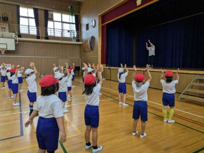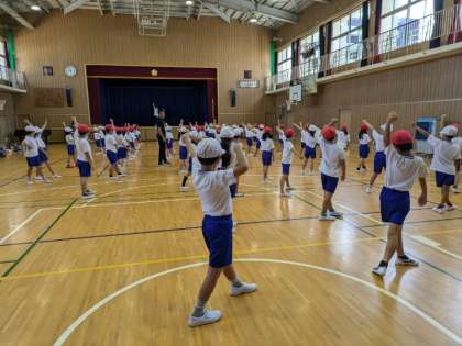 運動会で踊るダンスの練習の様子です。子どもたちは、いつも笑顔満開で練習に取り組んでいます。本番までもっともっと練習していきます。
