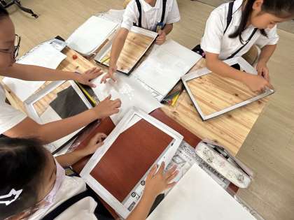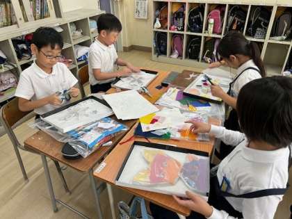 図工で、「光サンドイッチ」を制作しています。ボンドを使って、ペアの人と協力しながら枠を固定したり、かただんテープを作って好きな形を作りました。色セロハンを貼って光にかざすのが楽しみです。