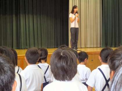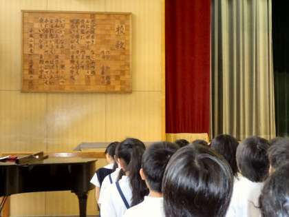 吉野小学校の朝会は、まず初めに吉野小学校の校歌を歌うところから始まります。今日は雨だったので、講堂でしたが、普段は運動場に子どもたちの声が響きます。次に、6年生の子どもの当番の人が前に出てあいさつの号令をかけて元気にみんなであいさつをします。そのあと、校長先生からのお話、係・委員会からの連絡と続きます。