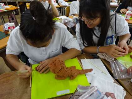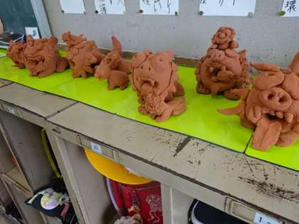 図画工作の時間に、5年1組でシーサーをつくりました。体と顔のバランスや、細かな作業に苦労する場面もありましたが、みんな思い思いのシーサーを楽しそうにつくっていました。