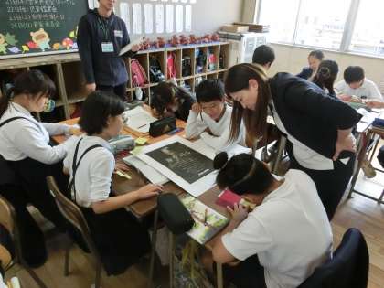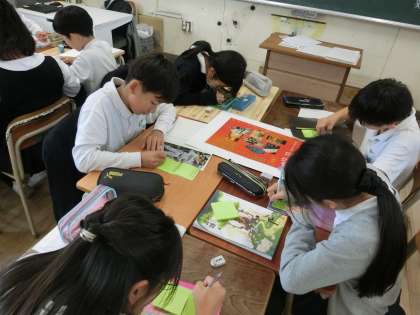 5年1組で国語科の公開授業があり校内の教員が参観しました。「和の文化を発信しよう」の単元で「ポスターにはどのような工夫があるのかを見つけよう」をめあてに、学習を進めました。グループになり、和の文化のポスターの特徴を見つけ交流し、発表しました。
