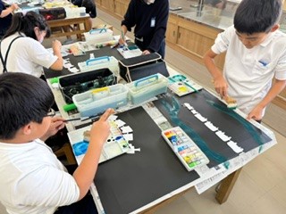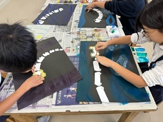 図画工作で宮沢賢治の「銀河鉄道の夜」をテーマに絵画を作成しています。前に学習した絵具のいろいろな技法を使いました。みんな思い思いの夜空を描いていました。