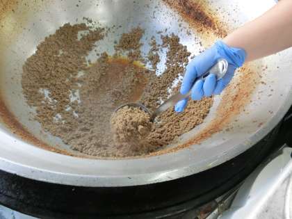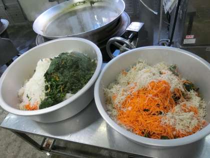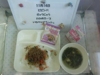 11月14日(木)の給食は「ビビンバ、わかめスープ、いもけんぴフィッシュ」でした。ビビンバは大人気の献立です。肉と野菜は衛生面を考慮して別配缶にしています。春のビビンバは切干しだいこんですが、秋のビビンバは生のだいこんを使っています。