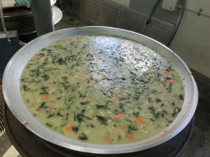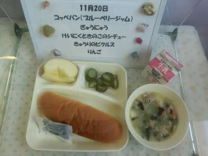 11月20日の給食は「コッペパン、牛乳、鶏肉ときのこのシチュー、きゅうりのピクルス、りんご」でした。だんだんと寒くなり、温かいシチューのおいしい季節になりました。今日は、乳アレルギーの人でも食べられるシチューです。エリンギ、マッシュルーム、しめじがたくさん入っていました。