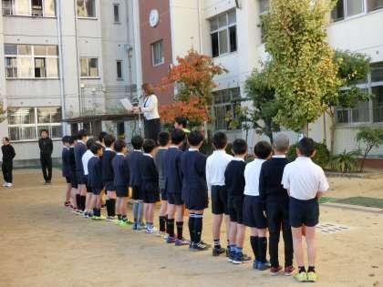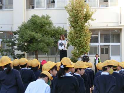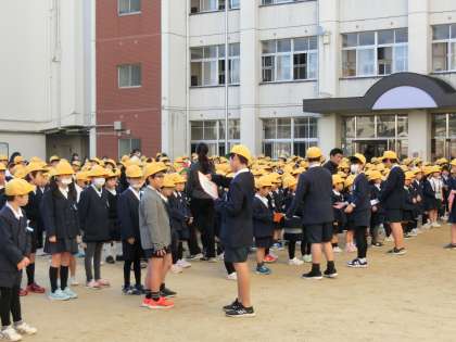 12月2日の全校朝会は、先週に引き続きソフトボールの表彰がありました。校長先生からは4日から始まる人権週間のお話があり、その後、環境委員会のみなさんが各クラスへ先週のピカピカ週間の認定書を配りました。