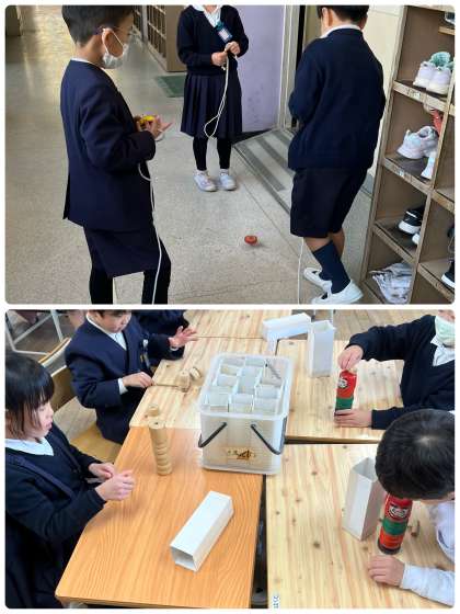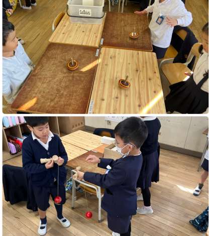 生活科で昔あそびをしました。お手玉・けん玉・こま回し・だるまおとし・はねつきなどの遊びをしました。はじめは「むずかしいー!」と言っていた子も何回もしていくうちに上手にできるようになり「たのしいなぁ」「もっとしたいなぁ」と楽しんでいました。