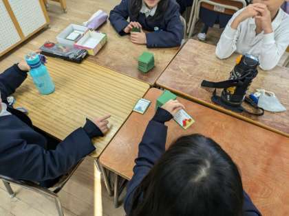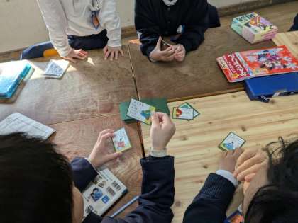 みんなで坊主めくりやいろはかるたをして遊びました。坊主めくりでは、札をめくるたびに「姫が出た‼」「よっしゃー!」など叫び声が聞こえてきて、とても盛り上がっていました。かるたでは、読み手を交代して友だちと仲良く遊んでいました。