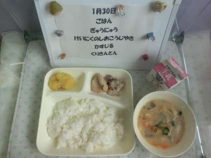 1月30日の給食は「ごはん、牛乳、鶏肉の塩こうじ焼き、かす汁、くりきんとん」でした。かす汁は年1回の献立で寒い日に嬉しい汁物でした。鶏肉は、今年度から使用の塩こうじで味つけしています。とてもやわらかく仕上がり大好評でした。くりきんとんは、生のさつまいもをゆで、くりを入れて仕上げています。甘さ控えめでとてもおいしかったです。