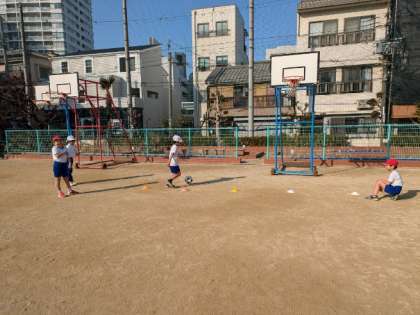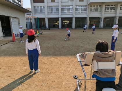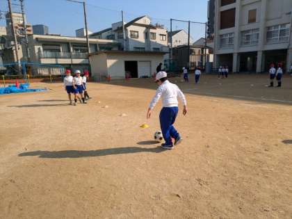 体育の学習では、ボールけり運動をしています。寒い中でも元気に体を動かして活動しています。グールプでパスの練習をしたり、ジグザグに動いたり、友だちからアドバイスをもらいながら楽しく活動しています。