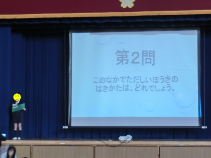 2月6日の児童集会は環境委員会の発表でした。正しいほうきやぞうきんなどの使い方について、写真や動画を使って、わかりやすくクイズ形式で説明してくれました。今日からみんなピカピカに掃除ができそうです✨
