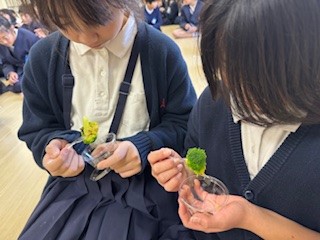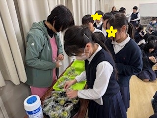 中央卸売市場の方に来ていただき、ブロッコリーについて教えていただきました。食べているのは蕾の部分であることや、ブロッコリーの生産が多い徳島県での農業の様子など、ブロッコリーに関するいろいろなお話を聞くことができました。最後にブロッコリーの試食をしました。「茎って甘くておいしいんだな」と茎もおいしく食べられることを体験しました。今取り組んでいる総合的な学習の時間でも、今日学んだことを生かせればと思います。