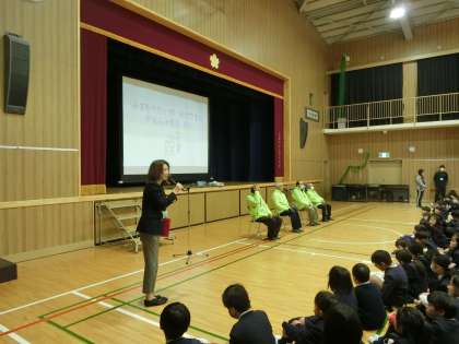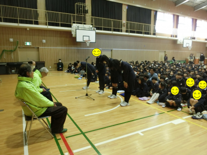 2月17日の全校朝会は「子ども見守り隊の皆様に感謝する集会」でした。子ども見守り隊の皆様は、吉野小学校の子どもたちが安全に登校できるよういつも、見守ってくださっています。今日はその感謝の気持ちを伝える会でした。見守り隊の方からは「吉野小学校のみなさんの朝の挨拶で元気をもらっています」とお話があり、児童代表からは感謝の言葉がありました。最後は、みんなで校歌を歌いました。
