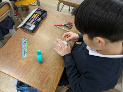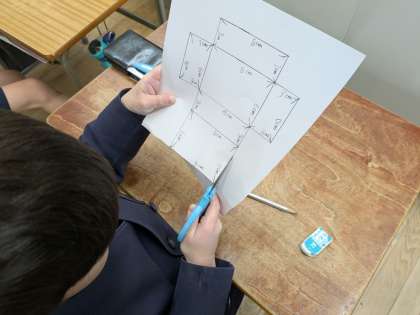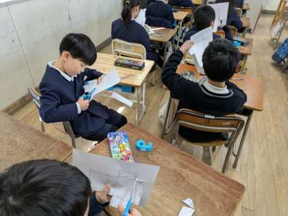箱の形の学習で、画用紙を切って箱を作りました。辺と辺を合わせるのに苦戦していました。面や辺の位置関係について学習できました。