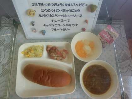 3月7日の給食は卒業祝い献立で「黒糖パン、牛乳、あげどりのバーベキューソース、カレースープ、キャベツとコーンのサラダ、フルーツゼリー」でした、いつもより1品多い献立で、小さな食器にフルーツゼリーが入っていました。あげどりはバーベキューソースがおいしく、大人気でした。6年生のみなさん、卒業おめでとう!